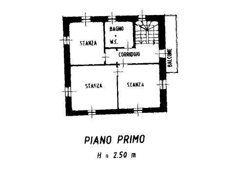 Das erste Obergeschoss umfasst zwei Schlafzimmer, Küche, ein Badezimmer, einen Flur und einen Balkon.