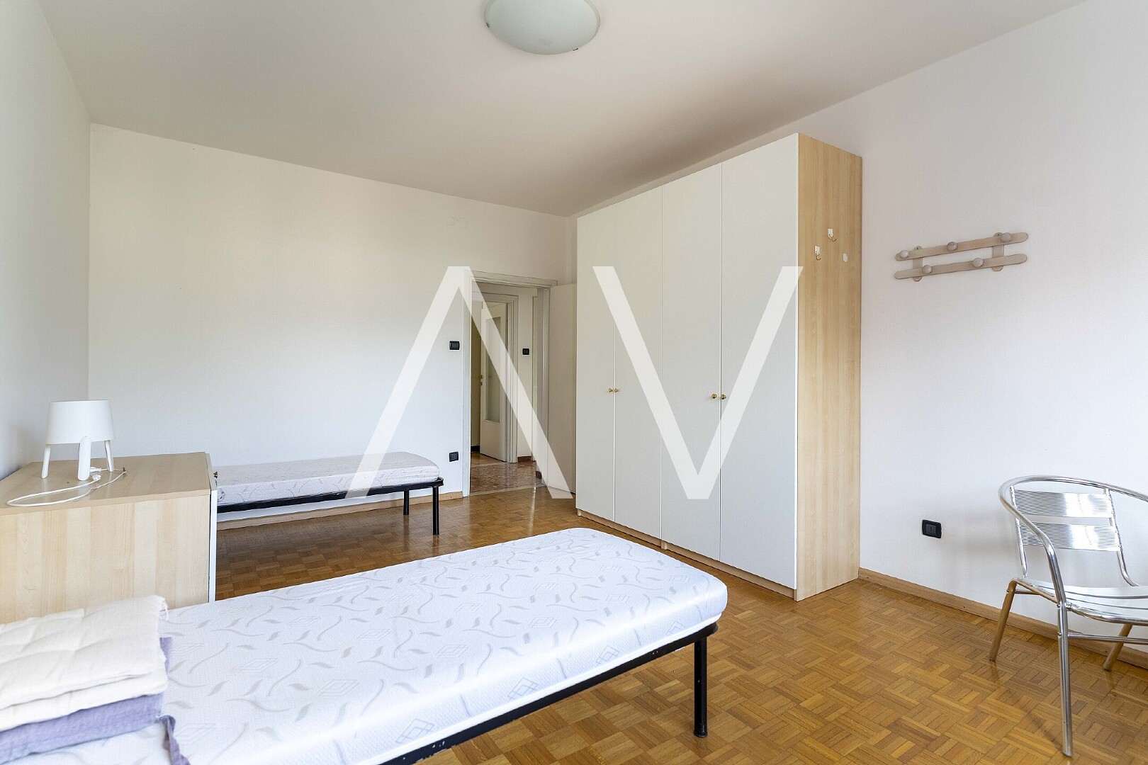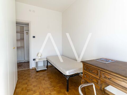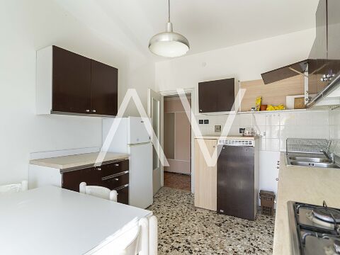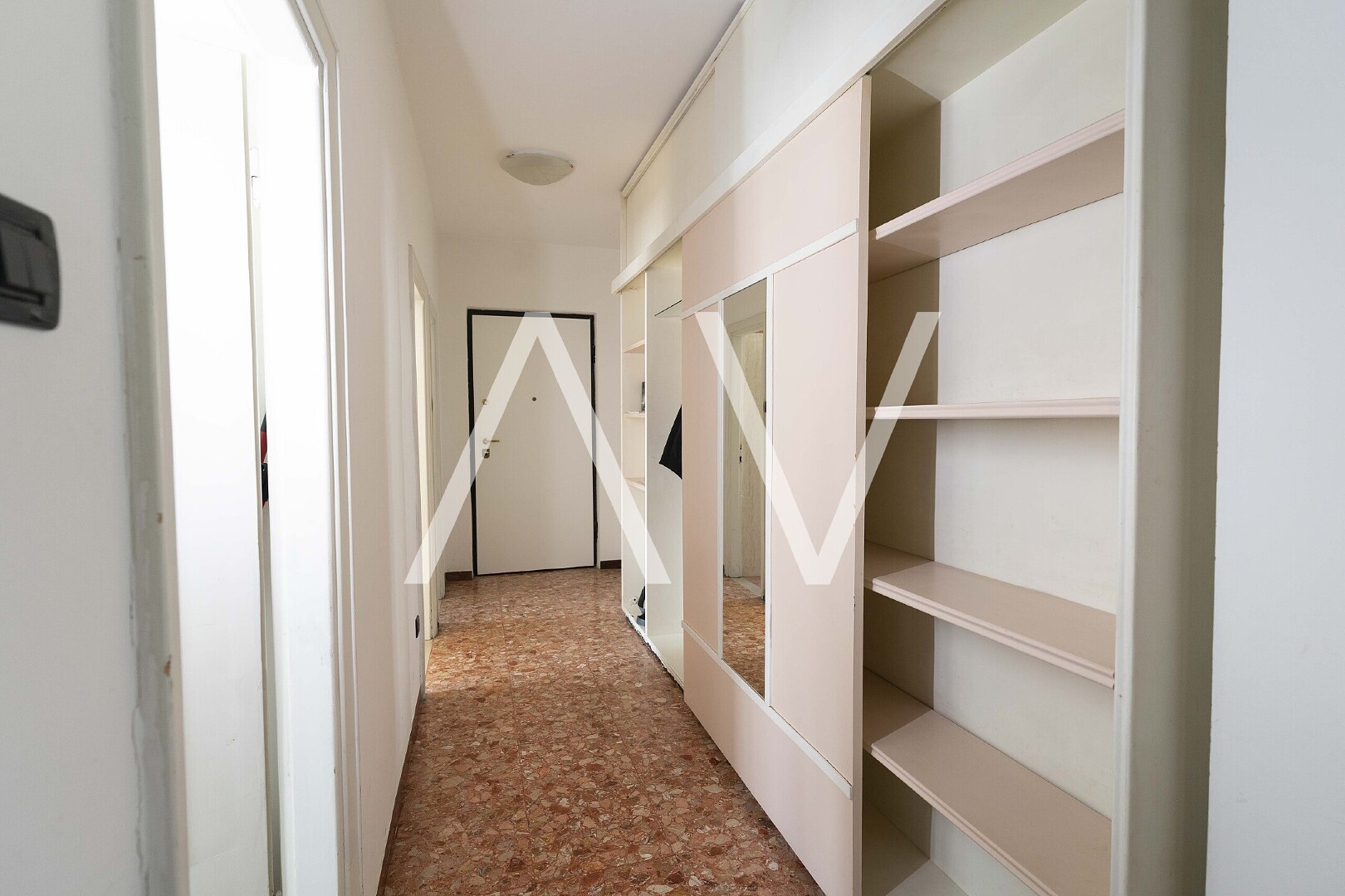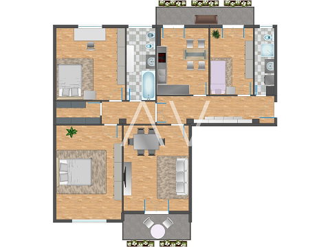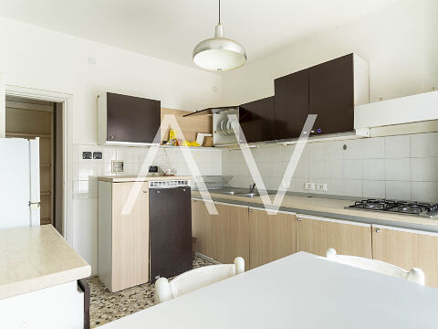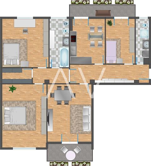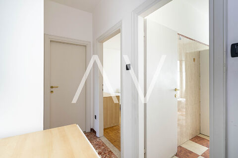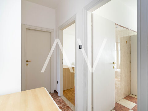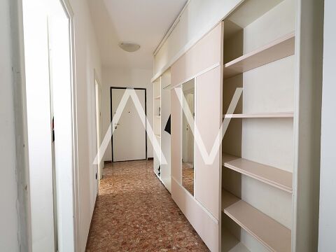 Beim Betreten der Wohnung gelangt man in einen zentralen Flur, von dem aus die Küche, ein Zimmer sowie ein Badezimmer erreichbar sind. Sowohl die Küche als auch das Zimmer bieten direkten Zugang zu einem Balkon. Über den Flur erreicht man zudem einen zweiten, abgetrennten Wohnbereich mit drei Schlafzimmern, einem weiteren Badezimmer sowie einem praktischen Abstellraum. Eines der Schlafzimmer verfügt über einen Zugang zu einem zweiten Balkon.