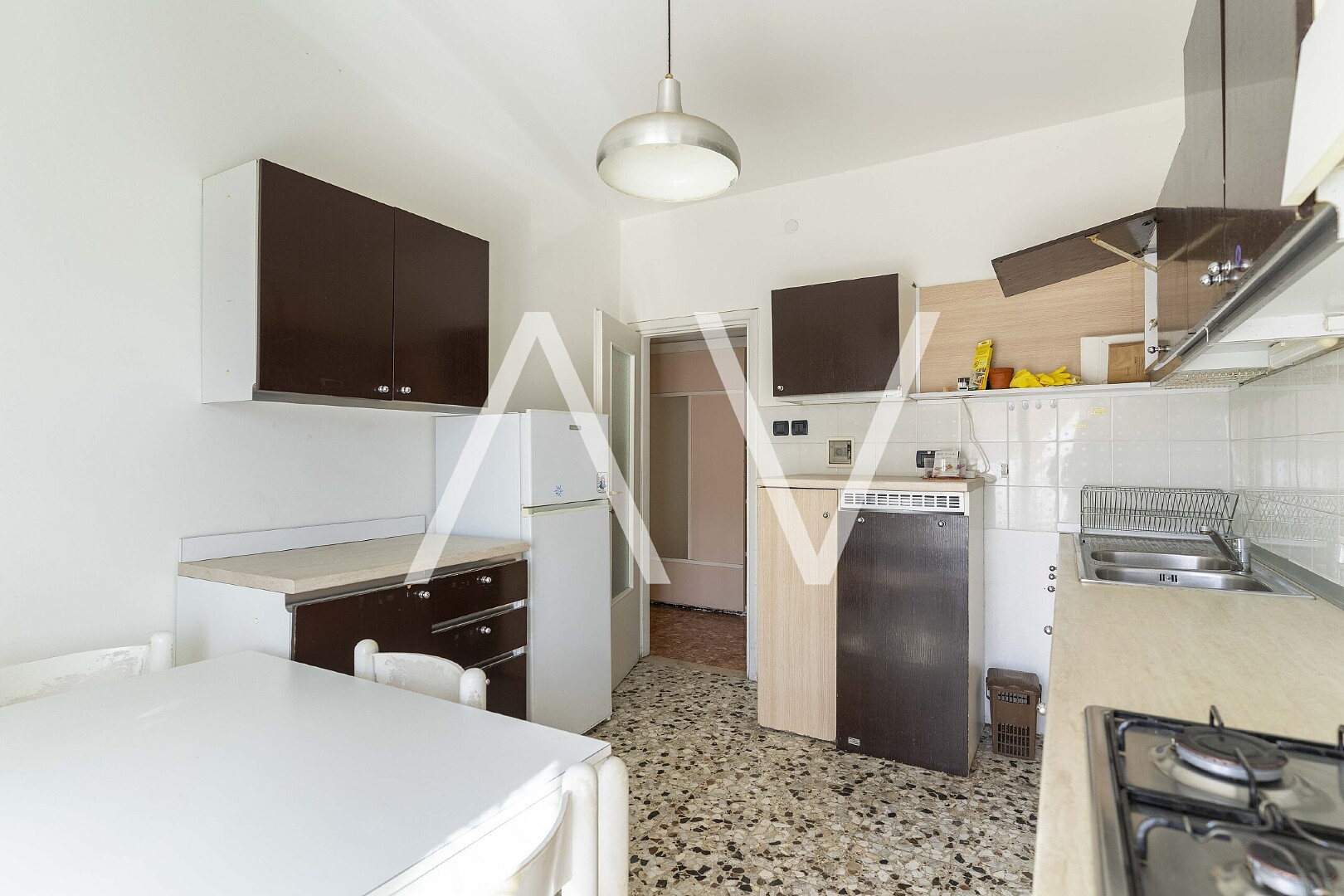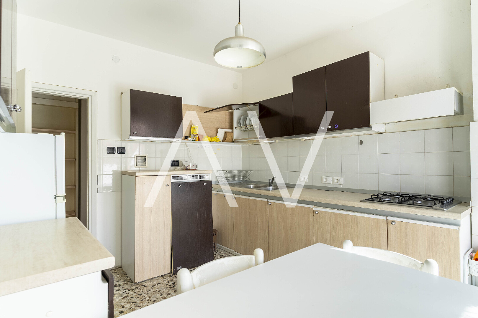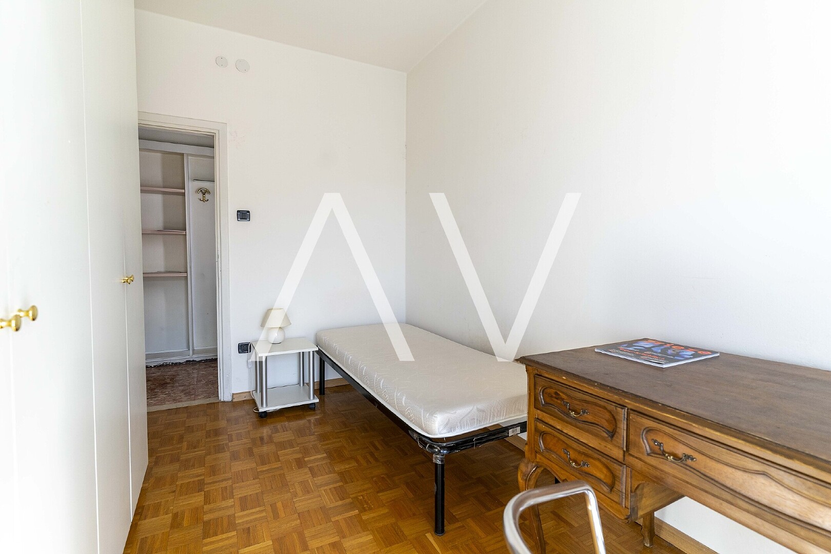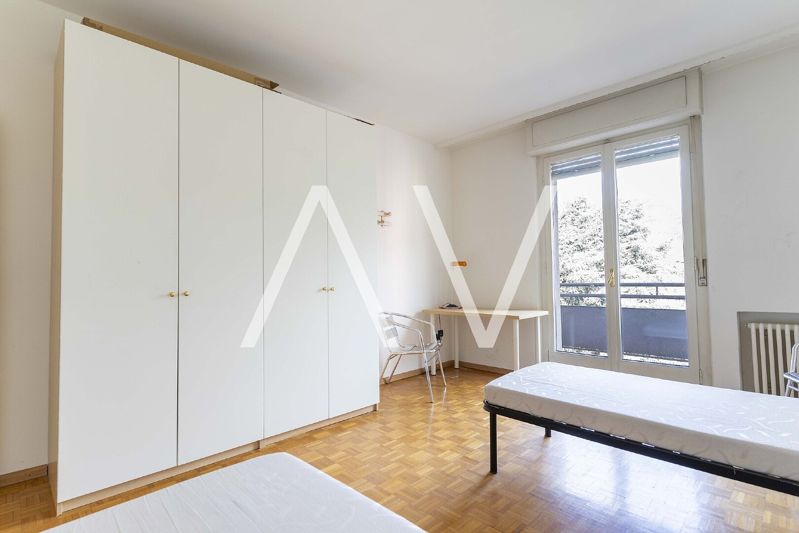 Beim Betreten der Wohnung gelangt man in einen zentralen Flur, von dem aus die Küche, ein Zimmer sowie ein Badezimmer erreichbar sind. Sowohl die Küche als auch das Zimmer bieten direkten Zugang zu einem Balkon. Über den Flur erreicht man zudem einen zweiten, abgetrennten Wohnbereich mit drei Schlafzimmern, einem weiteren Badezimmer sowie einem praktischen Abstellraum. Eines der Schlafzimmer verfügt über einen Zugang zu einem zweiten Balkon.