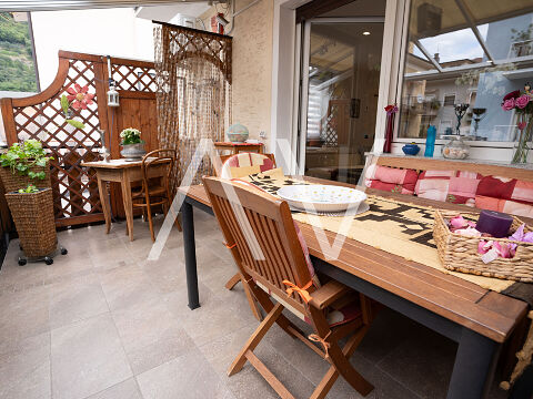 Darüber erstreckt sich, über zwei Etagen, eine geräumige Duplexwohnung. Der erste Stock bietet eine Küche mit kleinem Balkon, ein Wohnzimmer, sowie ein großes Badezimmer. Hinzu kommt eine Terrasse, auf welchem man beispielsweise entspannt im Freien grillen kann. In der Zweiten Etage befinden sich zwei Schlafzimmer, sowie ein kleineres Badezimmer. Highlight ist die weitläufige Terrasse, mit herrlichen Blick auf die umliegende Landschaft.