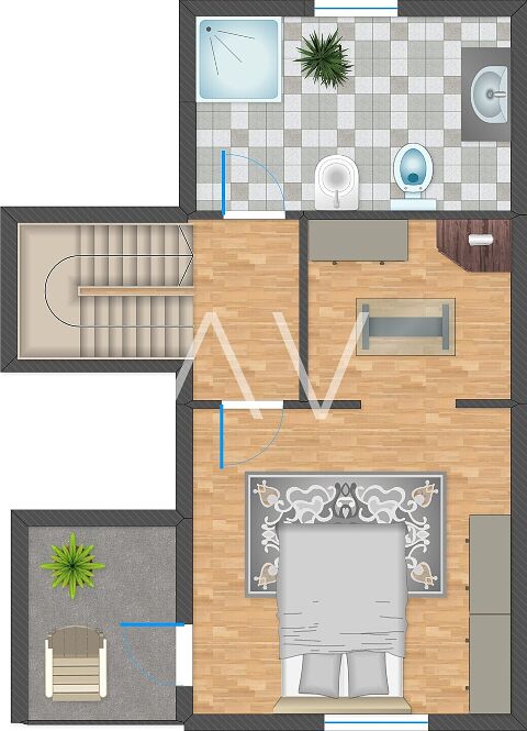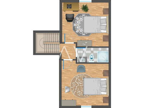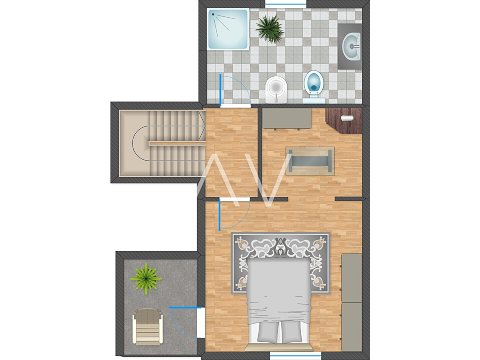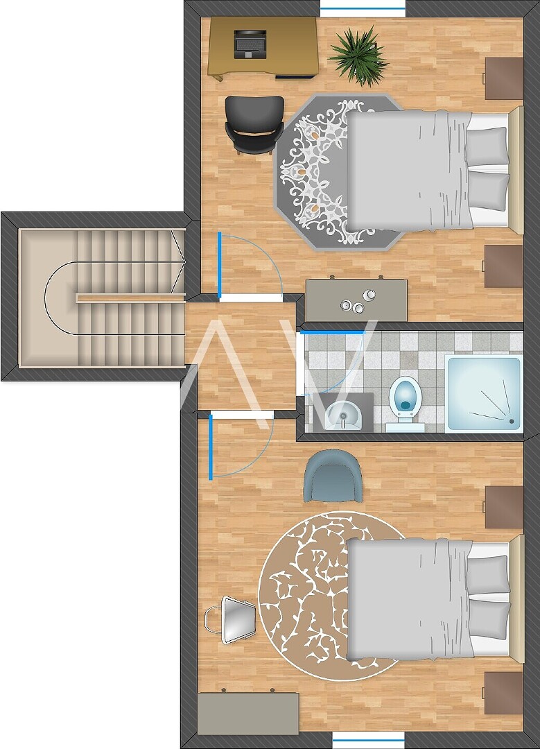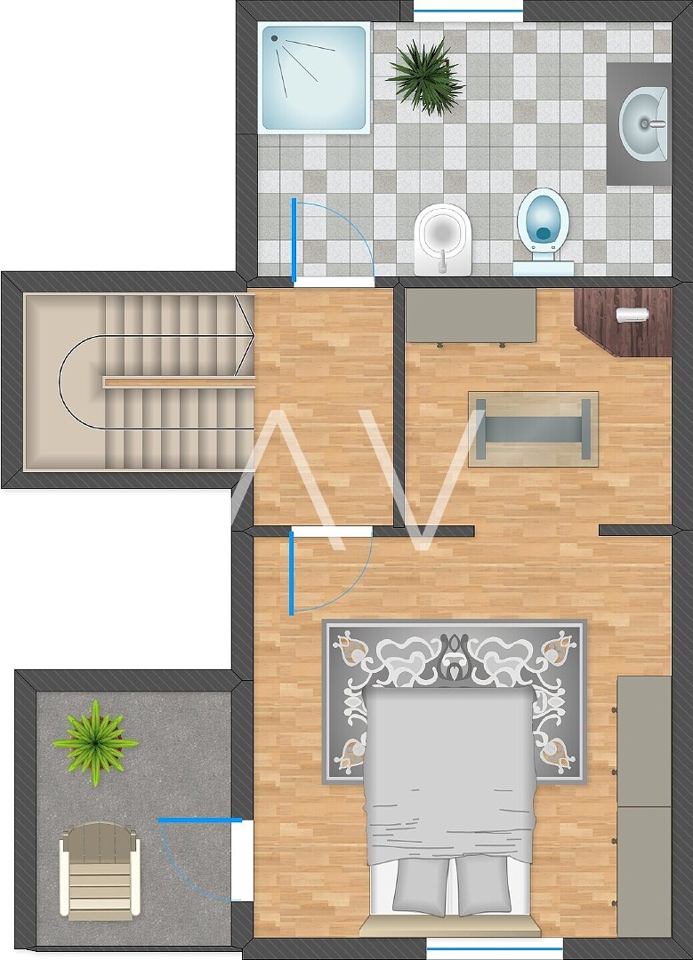 Im ersten Stock befindet sich ein geräumiges Schlafzimmer mit begehbarem Kleiderschrank, Balkon und einem großen Bad mit Dusche. Es besteht auch die Möglichkeit, ein zusätzliches Zimmer auf dieser Etage einzurichten. Im zweiten Stock befinden sich zwei Schlafzimmer und ein weiteres Badezimmer mit Dusche, ideal für Kinder oder Gäste.