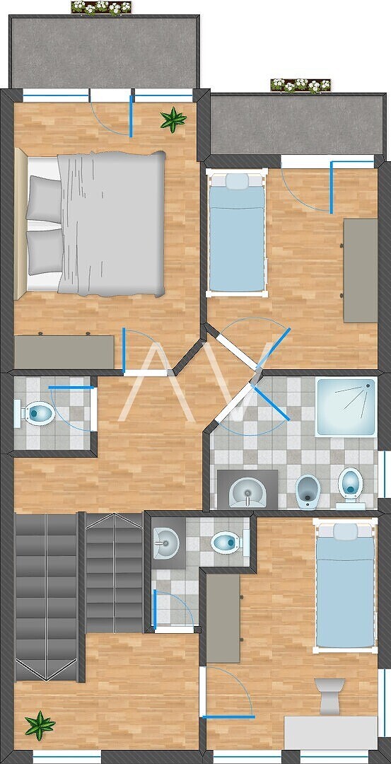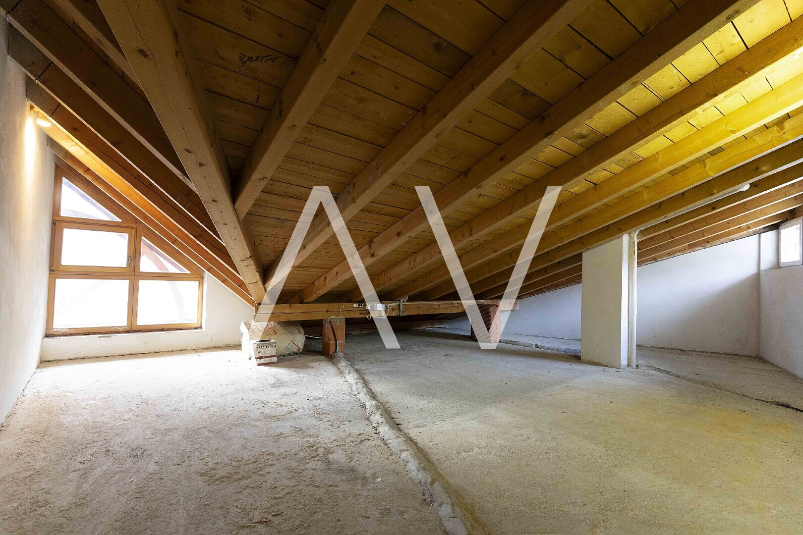 Das Obergeschoss umfasst drei Schlafzimmer. Zwei davon verfügen über einen direkten Zugang zu einem privaten Balkon und bieten zusätzlichen Wohnkomfort. Auf dieser Ebene stehen zudem ein separates WC sowie ein weiteres Badezimmer zur Verfügung. Außerdem ist ein Dachboden vorhanden, der sich ideal als zusätzlicher Stauraum eignet oder ausgebaut werden kann .