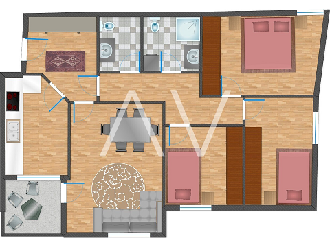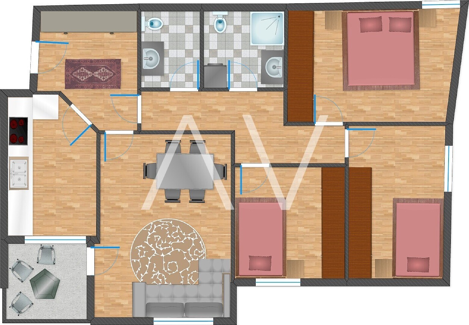 Die Immobilie ist unterteilt in einen geräumigen Eingangsbereich, eine Küche und ein sonnendurchflutetes Wohnzimmer. Diese intelligente Raumaufteilung ermöglicht es, bei Bedarf die Küche mit dem Wohnzimmer zu verbinden und somit einen großen offenen Wohnbereich zu gestalten. Weiters verfügt die Wohnung über drei Schlafzimmer und zwei Bäder. Ein Balkon erweitert den Wohnraum und lädt zum Verweilen ein. Zusätzlich zur Wohnung gehören ein Keller sowie ein Hobbyraum im 6. Obergeschoss, der sich direkt über der Wohnung befindet und im Kaufpreis inbegriffen ist. Dieser Raum kann flexibel genutzt werden, etwa als Arbeits-, Freizeit- oder Stauraum. Eine mögliche Verbindung mit der Wohnung ist denkbar, vorbehaltlich einer noch zu prüfenden technischen und rechtlichen Umsetzbarkeit.