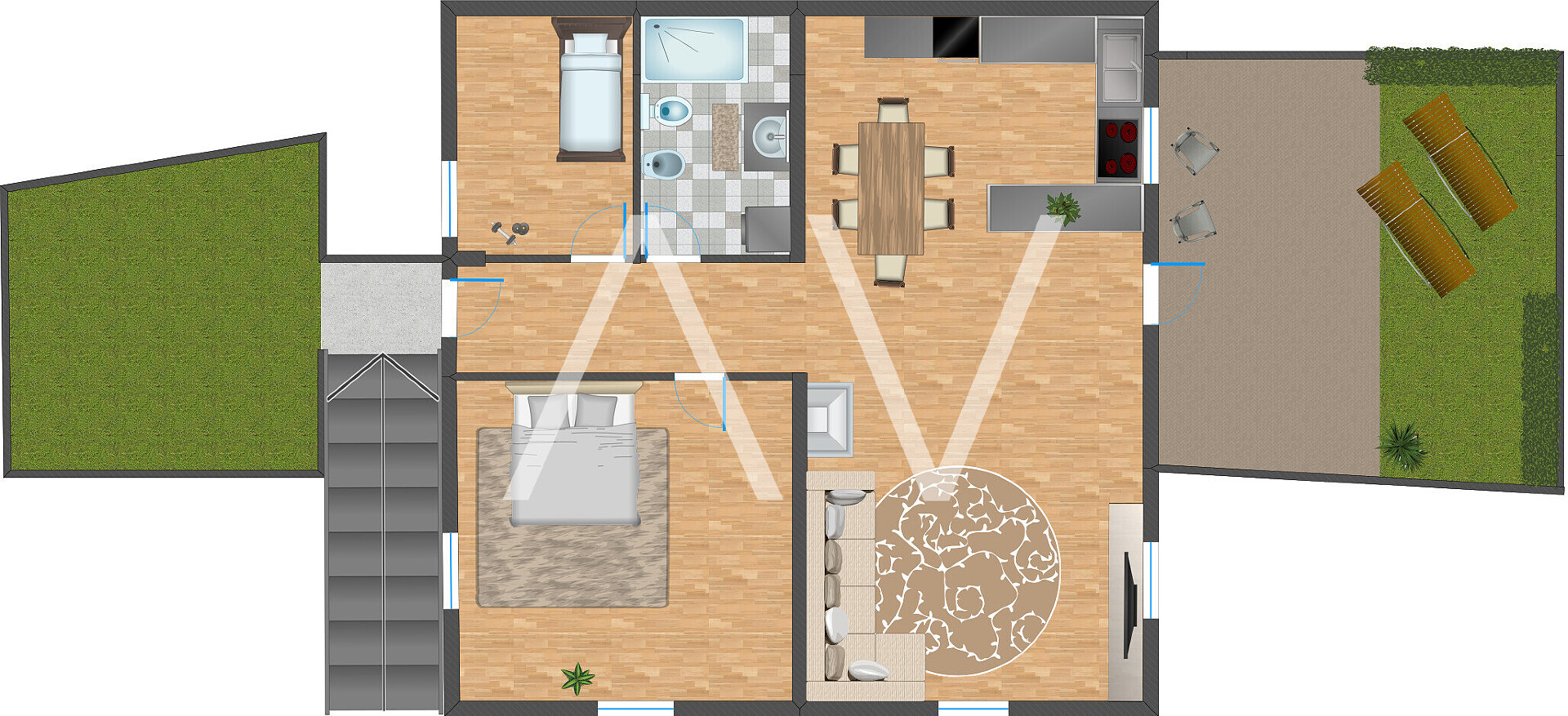 Ein besonderes Highlight ist der Außenbereich: Vor dem Haus befindet sich ein kleiner Gemüsegarten, während sich hinter dem Haus – direkt angrenzend an den Wald – ein weiterer Garten mit gemütlicher Terrasse befindet, der viel Privatsphäre und Erholung im Grünen bietet.